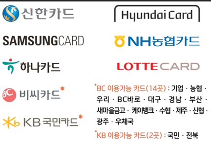 - 비씨카드 : 기업, 농협, 우리, BC바로, 대구, 경남, 부산, 새마을금고, 케이뱅크, 수협, 제주, 신협, 광주, 우체국